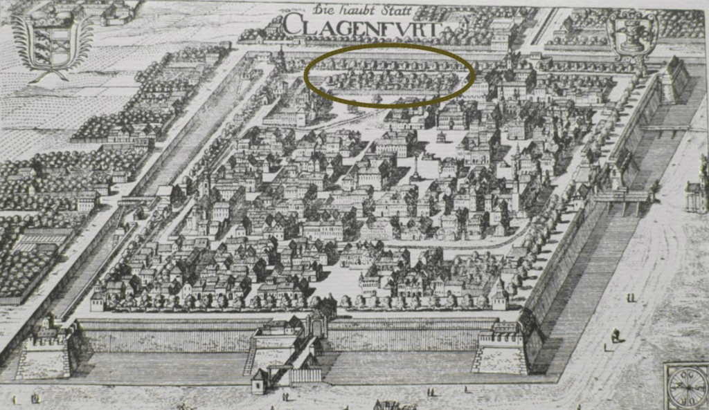 Abb. 14: Johann Weikhard Valvasor – Klagenfurt, 1688 . Deutlich ist die unbebaute (bis auf kleine Ausnahmen)